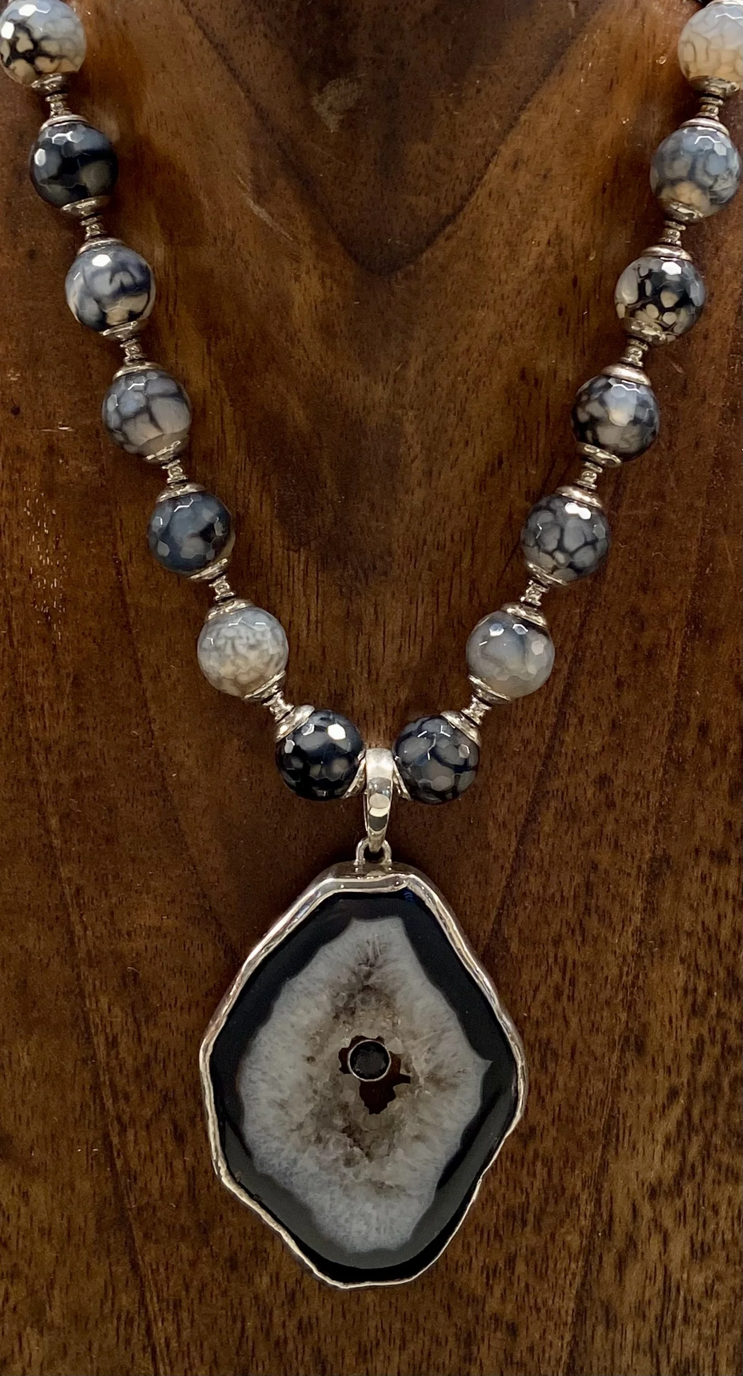 Sardonyx barrel beads surround neckline; Sterling silver leaf with bezel set black and white rectangular druzy pendant; 17” necklace, pendant drops an additional 3” lower