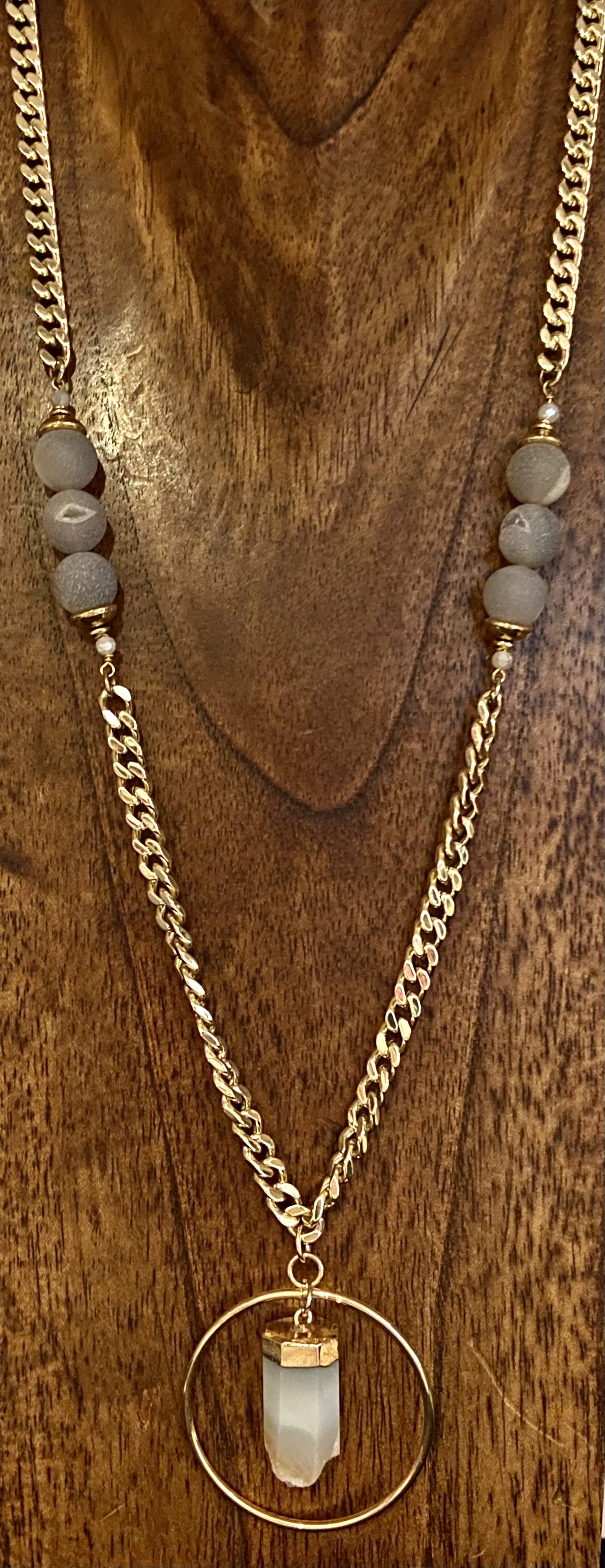 Long gold finish chain and pale gray druzy stones surround the neckline; Circular pendant with pale gray quartz crystal within; 42” necklace, pendant drops an additional 2” lower