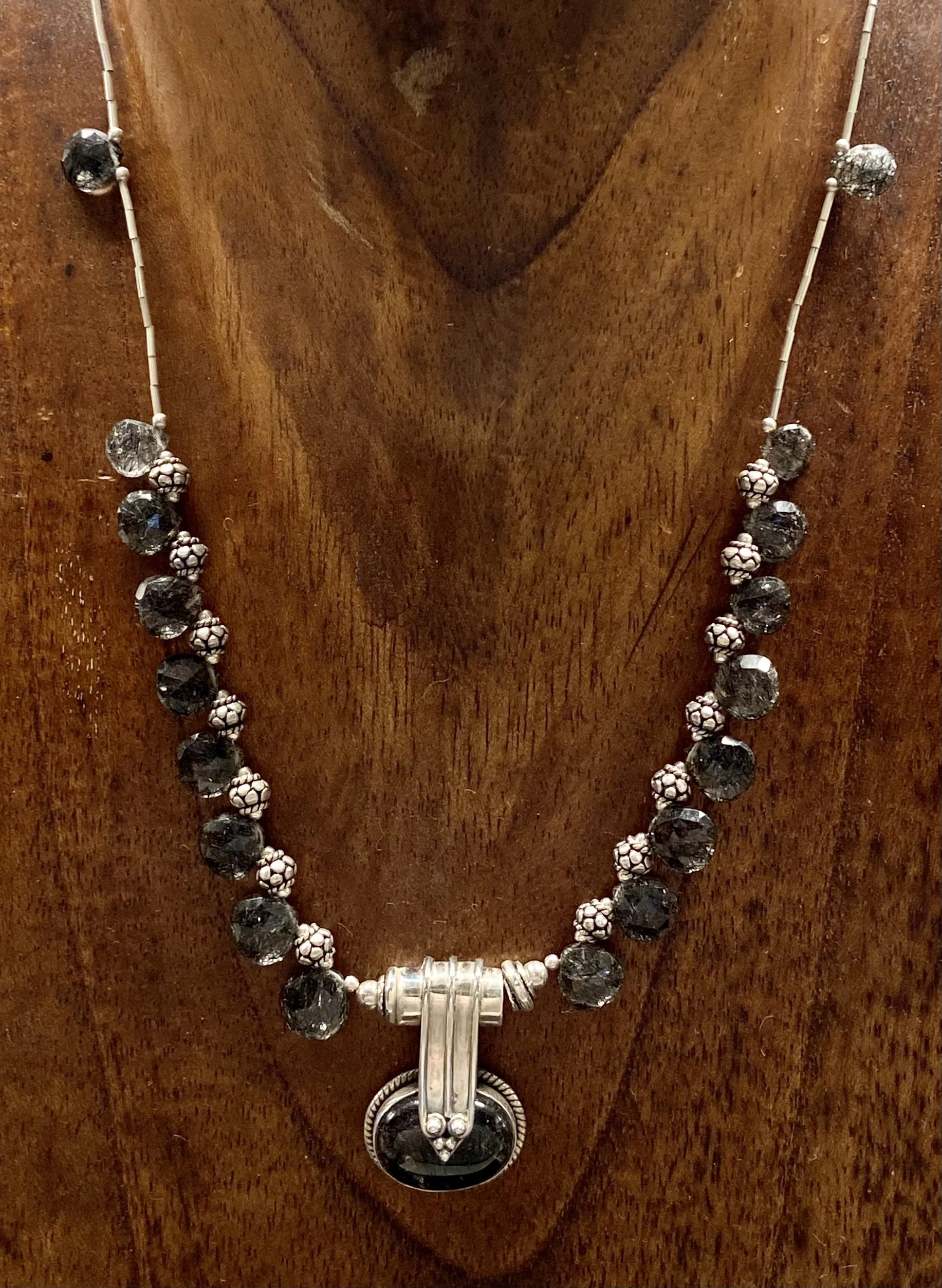 Rutilated black quartz with sterling silver forms this delicate neckline; Pendant is an oval rutilated black quartz stone with sterling silver; 15” necklace plus 3” extender, pendant drops an additional 1” lower