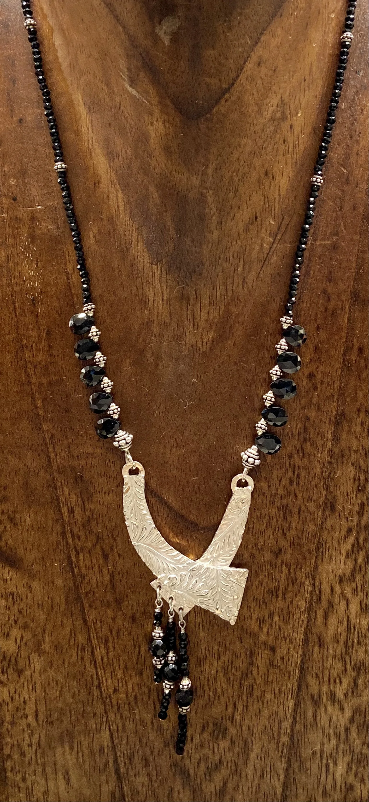 Onyx briolettes and spinal rondelles surround the neckline; Pendant is handmade sterling silver with 3 onyx spiral drops; 18” plus 3” extender