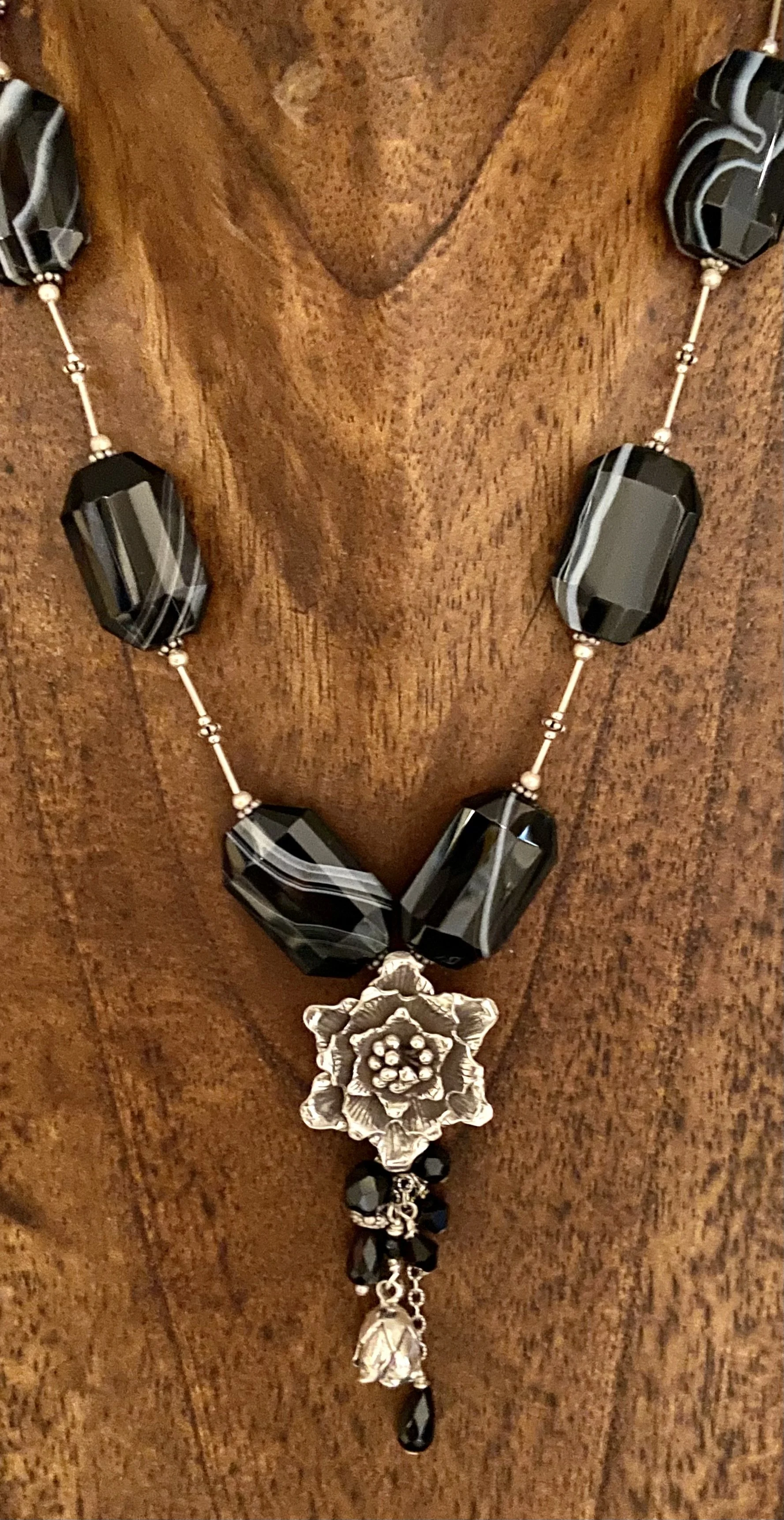 Faceted sardonyx rectangular beads spaced with sterling silver rectangular tubes; Pendant is Hill Tribe sterling silver flower with onyx and sterling silver tassels; 18” necklace, pendant drops an additional 3” lower
