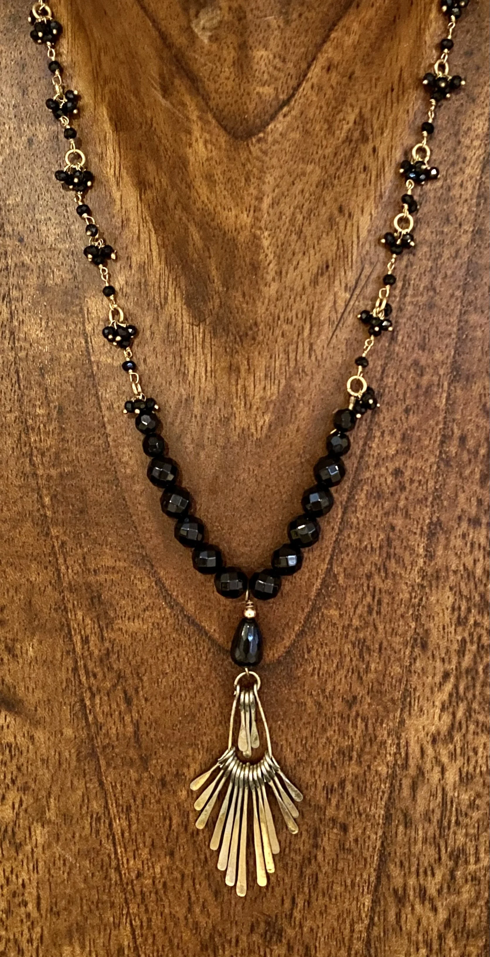 Graduated round onyx beads with onyx clusters along gold filled chain; Onyx teardrop and gold finish paddle pendant; 9.5” necklace, pendant drops an additional 2.5” lower