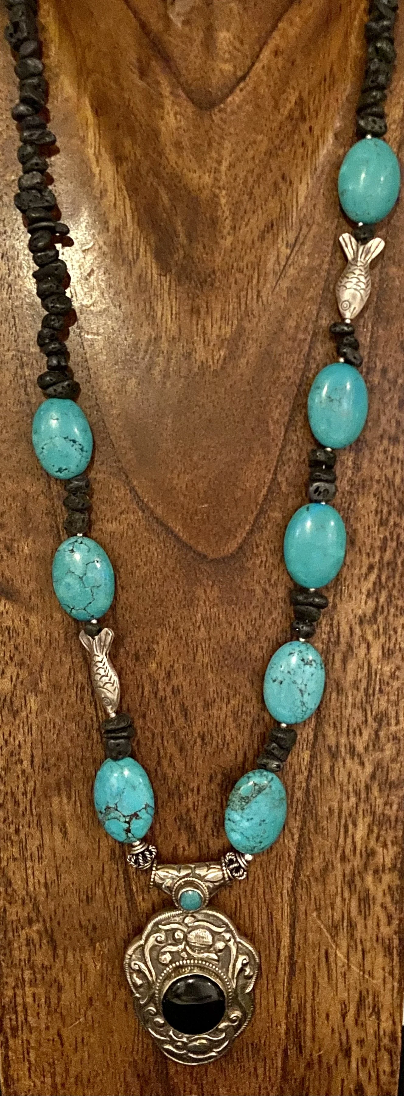 Turquoise and matte onyx with Hill Tribe silver fish surround the neckline in an asymmetric pattern; Pendant is vintage from Tibet with onyx in the center of carved sterling silver, intricately carved on the backside; 20” necklace plus 4” extender, pendant drops an additional 2.5” lower