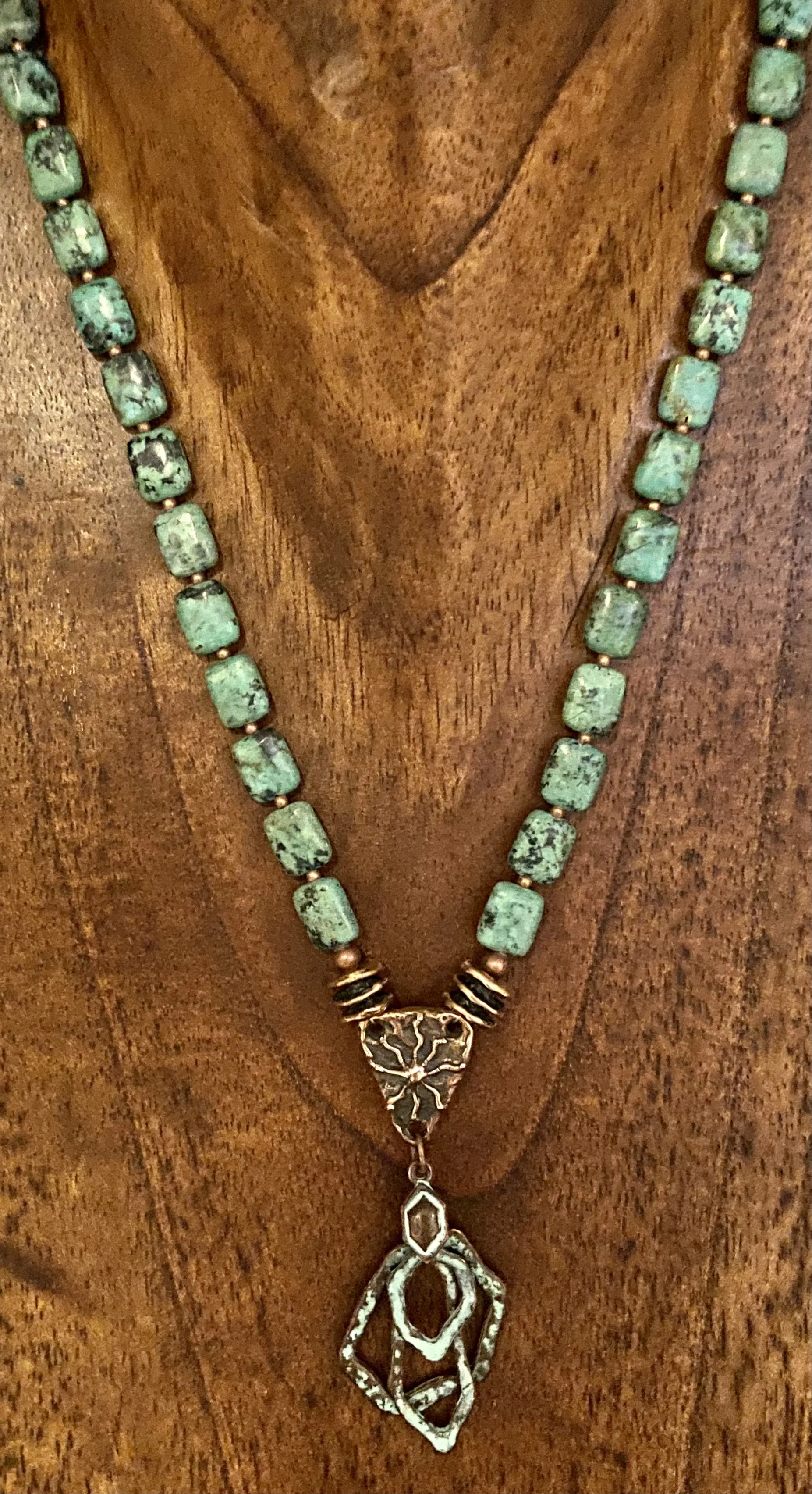 African turquoise rectangles with bronze components and unique pendant; 16” necklace plus “ extender, pendant drops an additional 2” lower