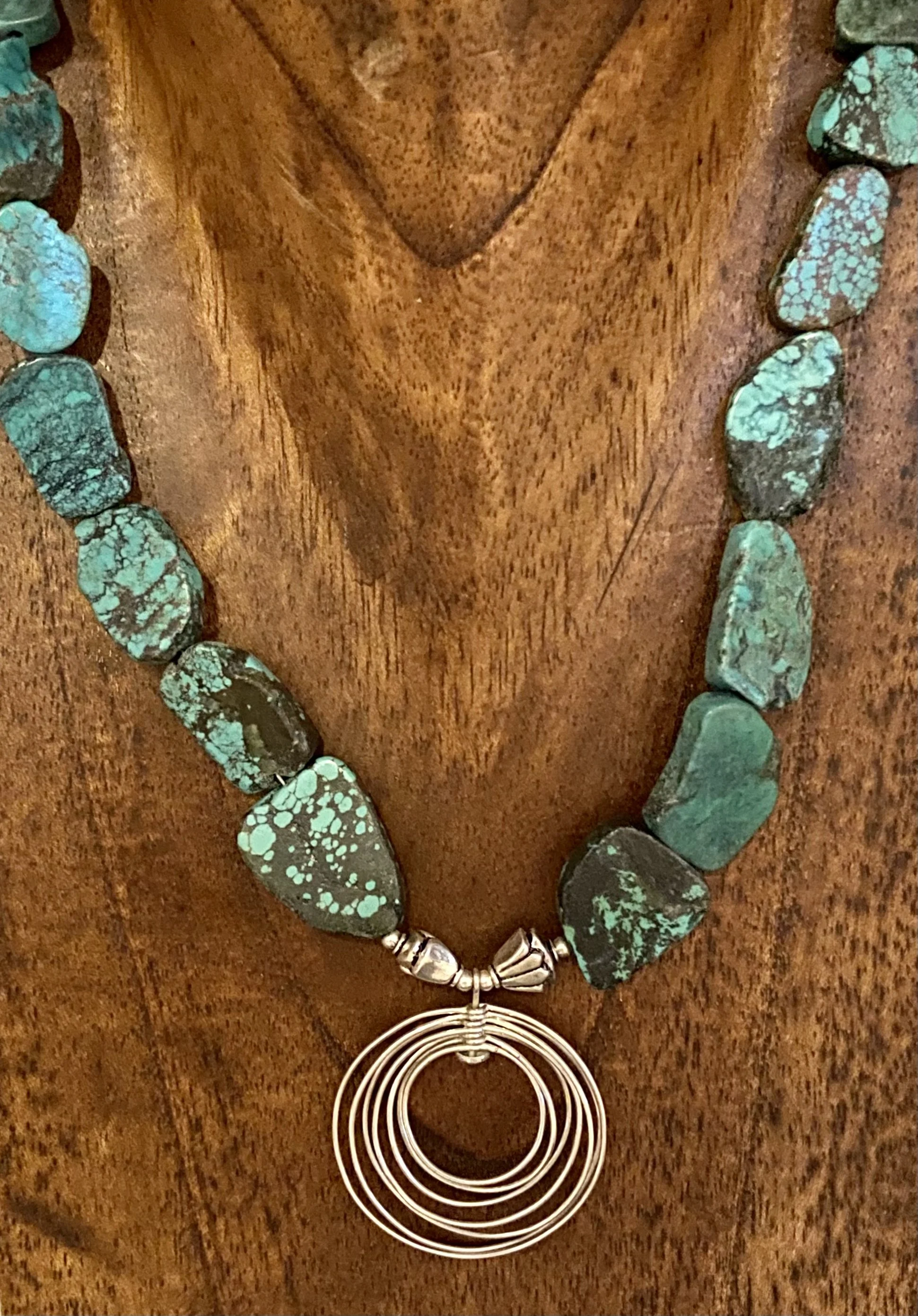 Free-form turquoise slabs surround the neckline; Pendant is sterling silver concentric circles; 17” necklace plus 2” extender, pendant drops an additional 1.5” lower
