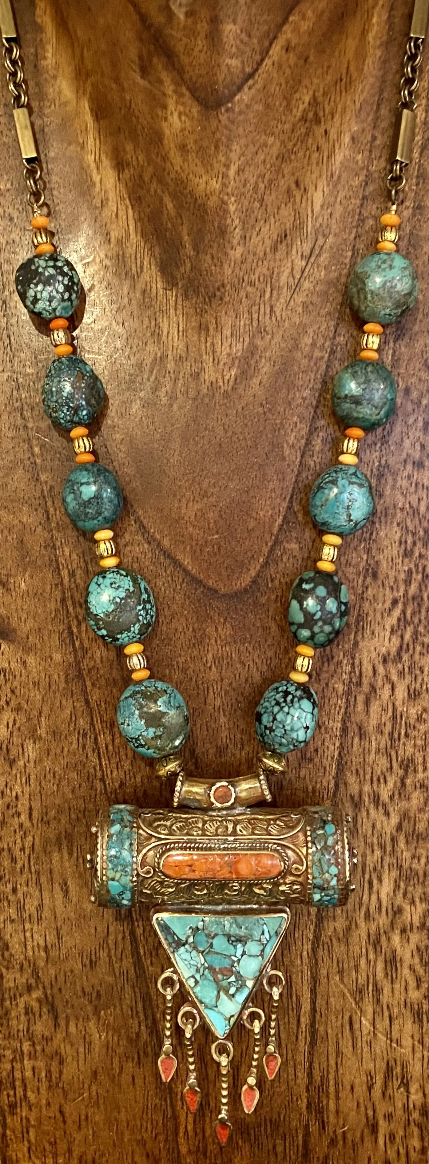 Turquoise disc shaped beads surround neckline; Pendant is turquoise/lapis lazuli and brass from India; 18” necklace, pendant drops an additional 2” lower
