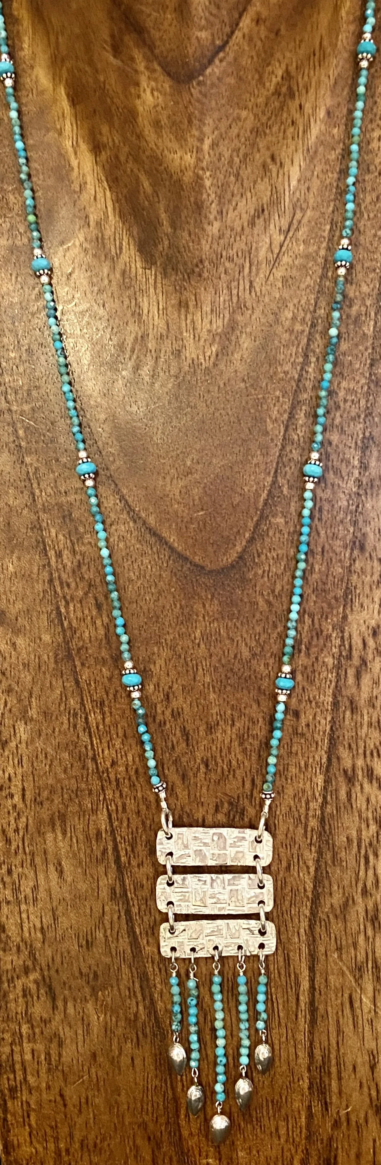 Tiny turquoise rondelles surround the neckline; Pendant is 3 embossed, sterling silver horizontal bars with turquoise tassels and silver drops; 27” necklace, pendant drops an additional 3” lower