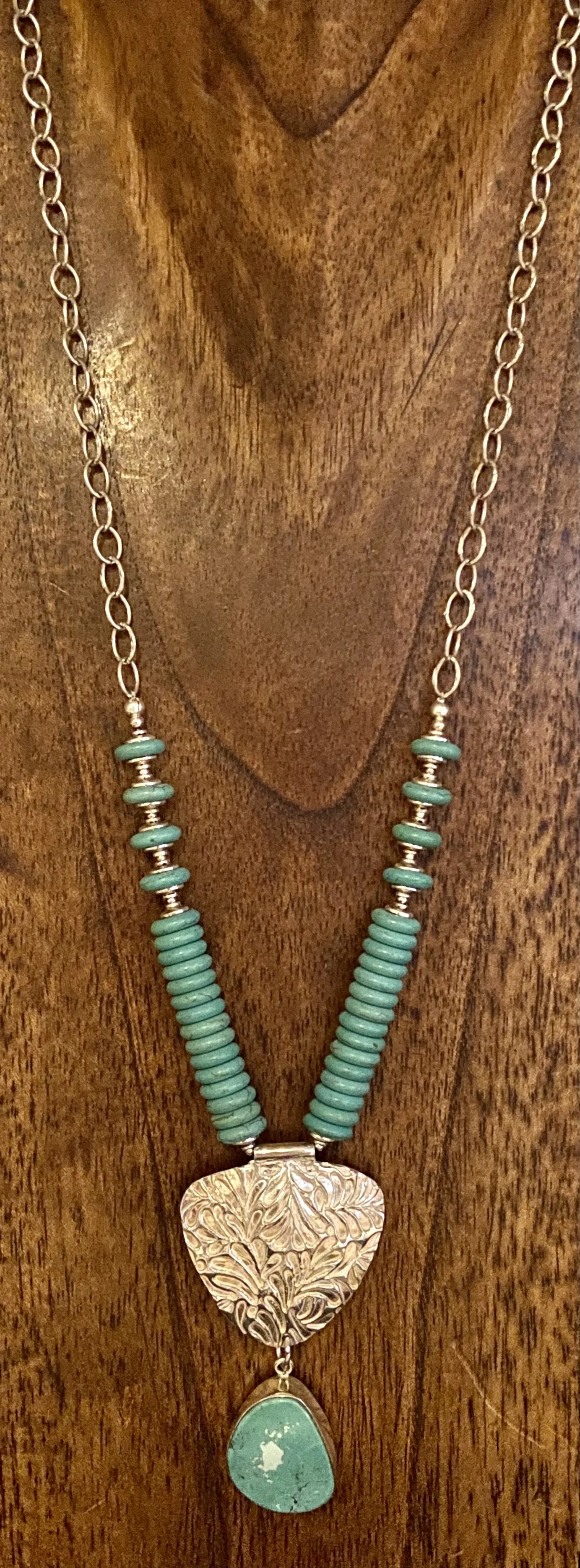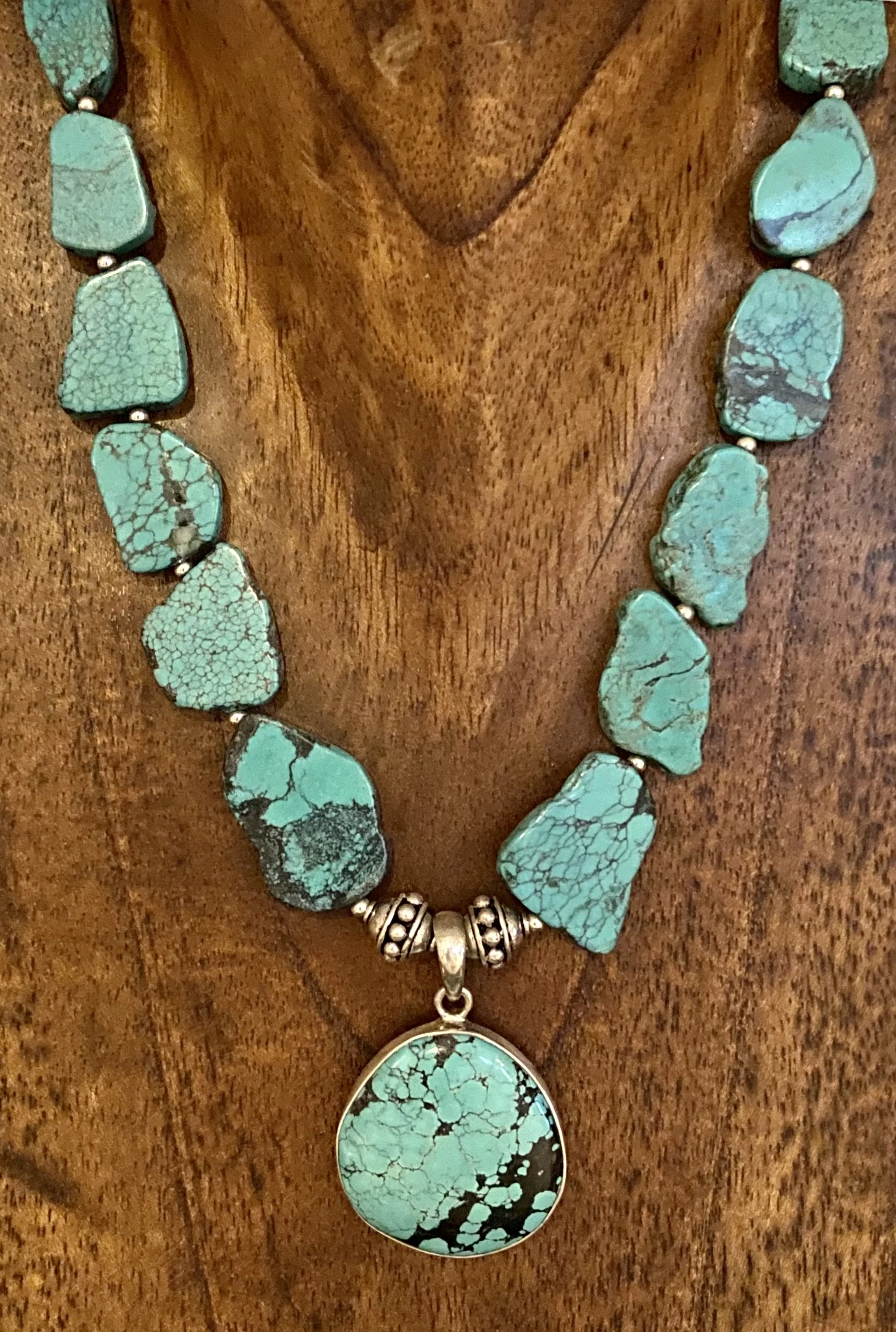 Flat, free-form turquoise slabs surround the neckline; Pendant is unique bezel set turquoise; 18” necklace plus 3.5” extender, pendant drops an additional 1.5” lower