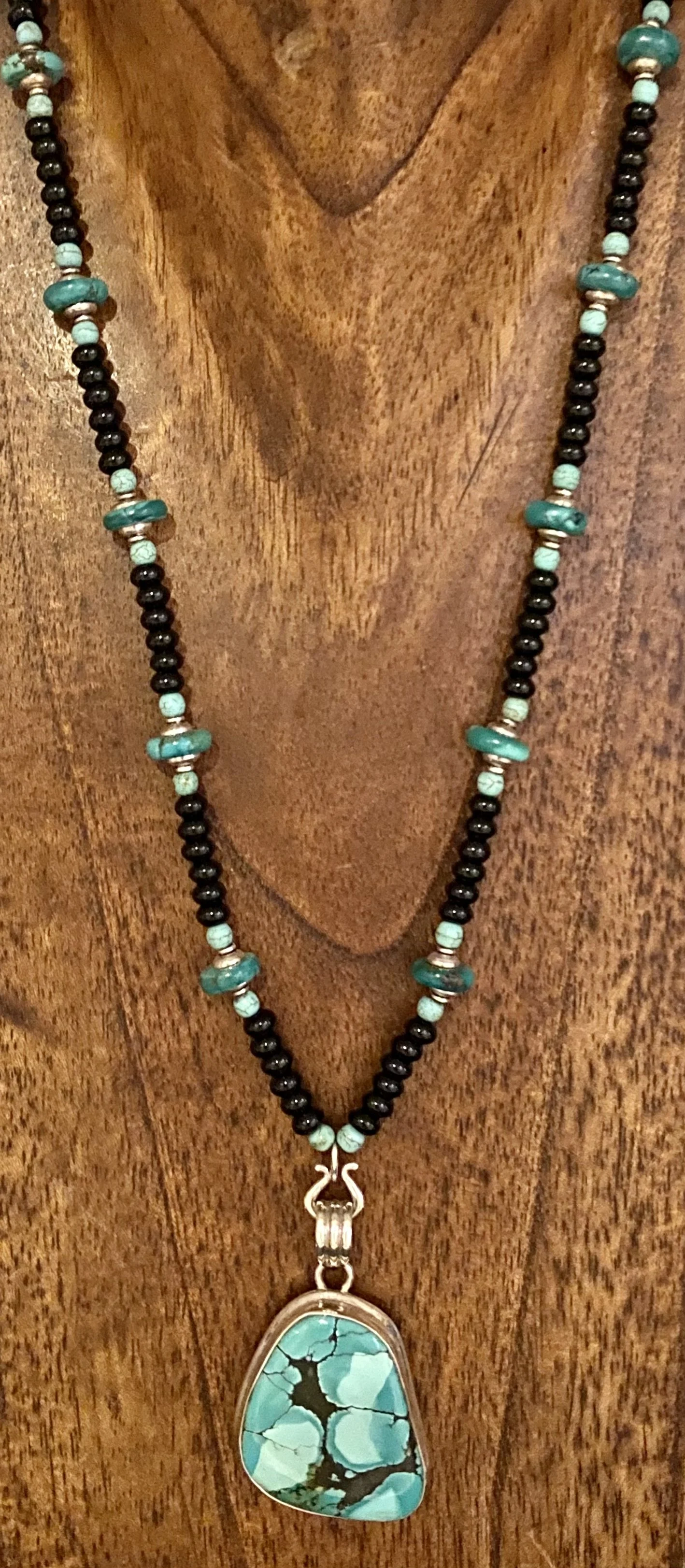 Turquoise and onyx beads surround the neckline; One of a kind bezel set turquoise pendant; 23” necklace plus 2.5” extender, pendant drops an additional 2” lower