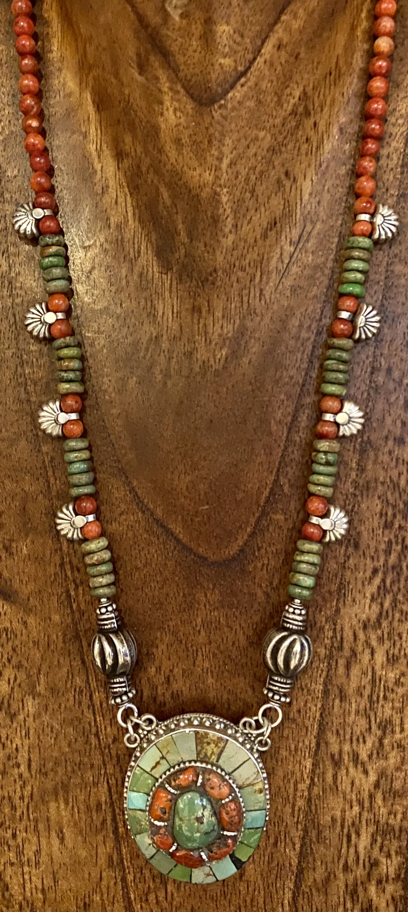 Hill Tribe sterling silver beads with green turquoise and coral surround the neckline; Pendant is vintage marquetry, bezel set green turquoise oval with inset coral; 24” necklace, pendant drops an additional 2” lower