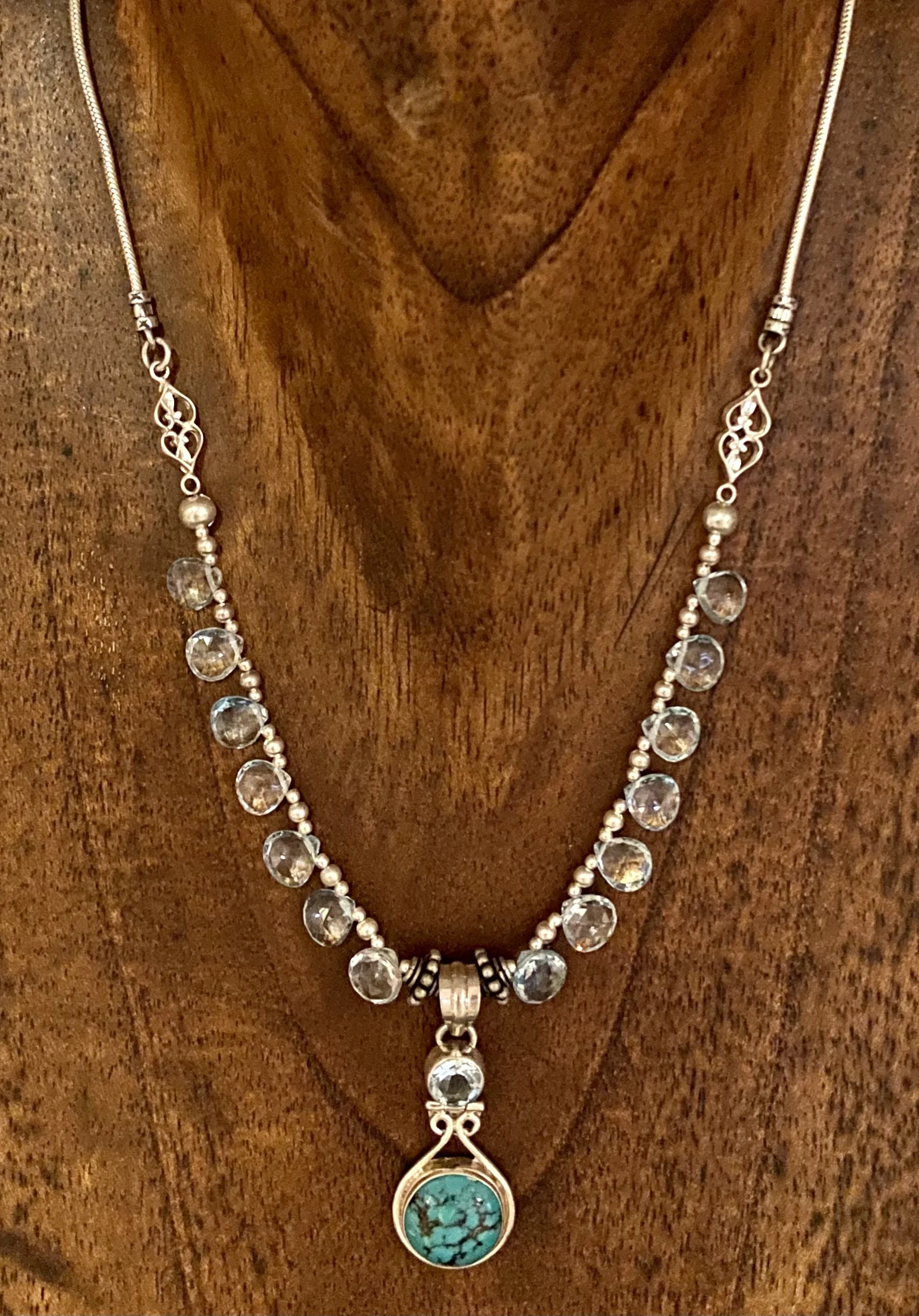 Faceted aquamarine briolettes and delicate snake chain surround the neckline; Pendant is round bezel set turquoise and faceted aquamarine; 18”necklace, pendant drops an additional 1.5” lower